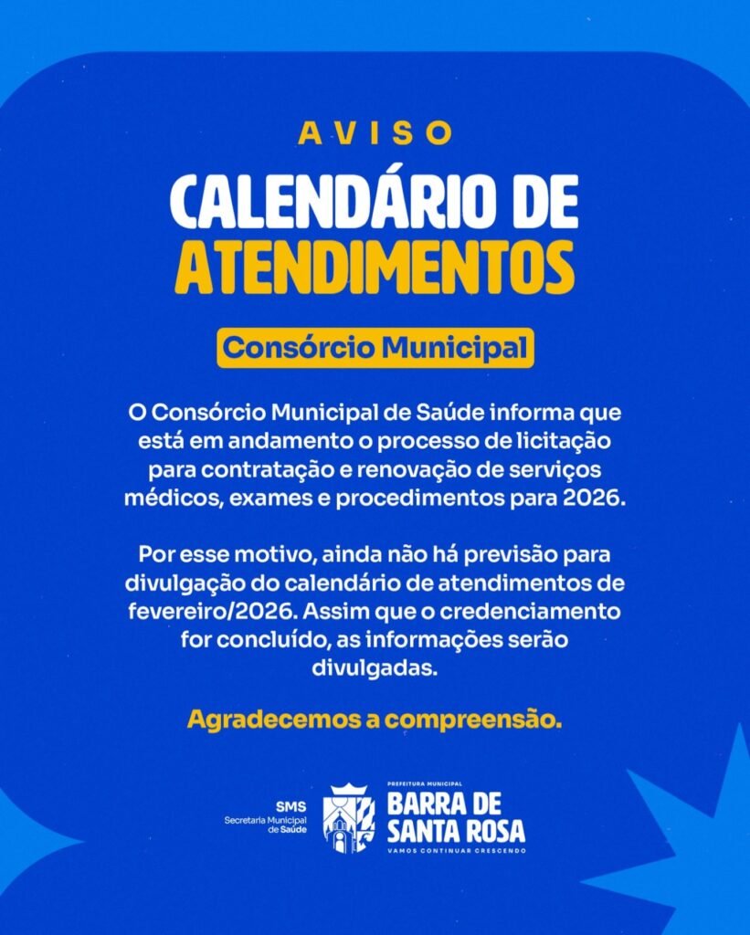A Prefeitura de Barra de Santa Rosa, por meio da Secretaria Municipal de Saúde (SMS), informou que ainda não há previsão para a divulgação do calendário de atendimentos do Consórcio Municipal referente ao mês de fevereiro de 2026.