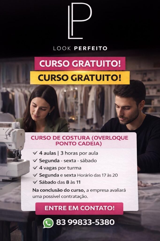Uma oportunidade para quem deseja aprender uma nova profissão está sendo disponibilizada em Prata, no Cariri da Paraíba. A iniciativa oferece um curso gratuito de costura, com foco nas técnicas de overloque e ponto cadeia, voltado para iniciantes ou pessoas que desejam se aperfeiçoar na área.