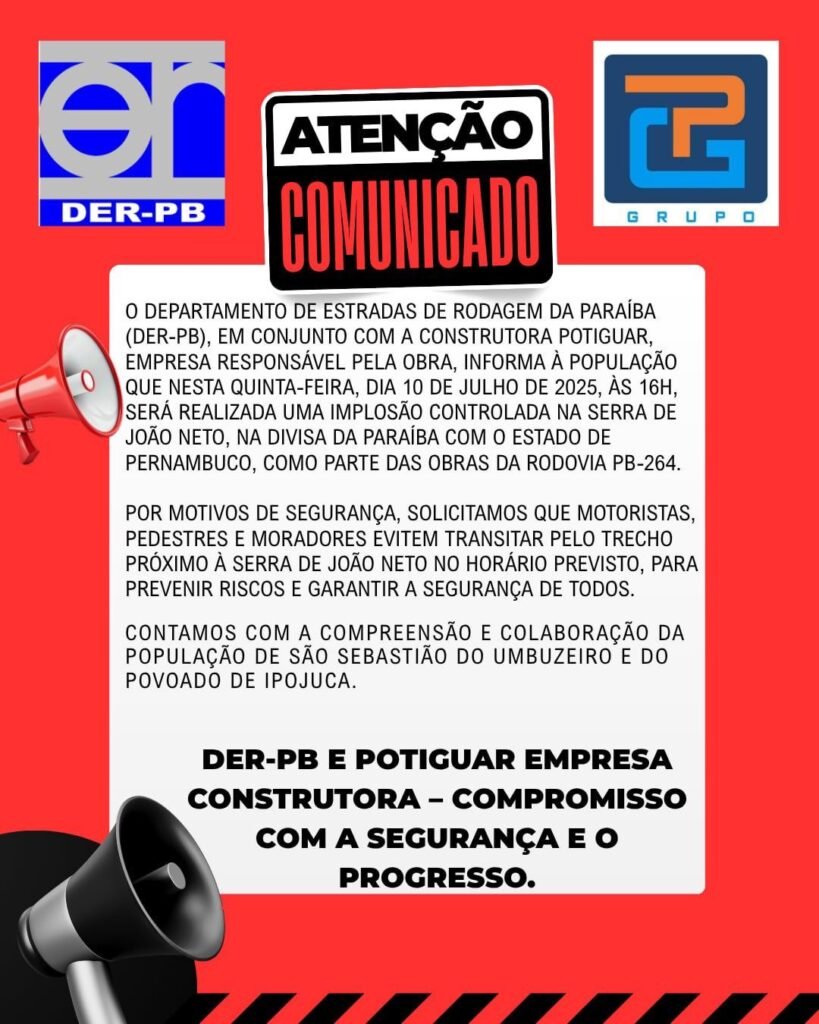 O Departamento de Estradas de Rodagem da Paraíba (DER-PB), em parceria com a Construtora Potiguar, responsável pelas obras, divulgou nesta semana um comunicado importante à população sobre a realização de uma implosão controlada na Serra de João Neto, localizada na divisa entre a Paraíba e o estado de Pernambuco. A operação está marcada para a próxima quinta-feira, dia 10 de julho de 2025, às 16h, e integra o cronograma das obras de melhoria da rodovia PB-264.