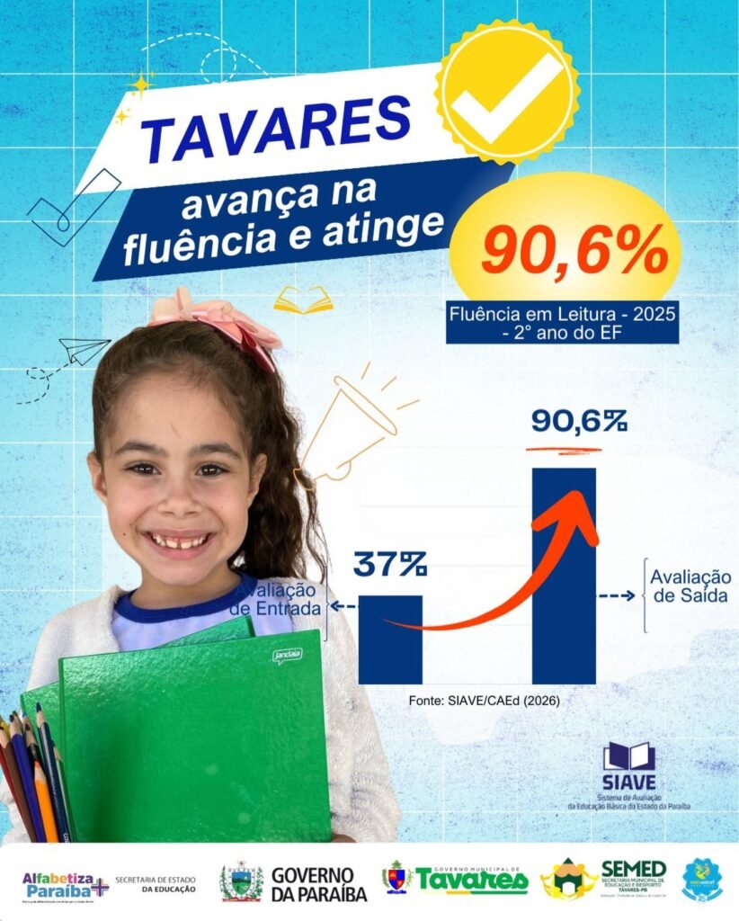 A educação do município de Tavares segue apresentando resultados expressivos e motivo de orgulho para toda a população. De acordo com dados do Sistema de Avaliação da Educação Básica da Paraíba (SIAVE/CAEd), a fluência em leitura dos alunos do 2º ano do Ensino Fundamental chegou a 90,6% em 2025, um avanço significativo em relação ao início do ciclo avaliativo.
