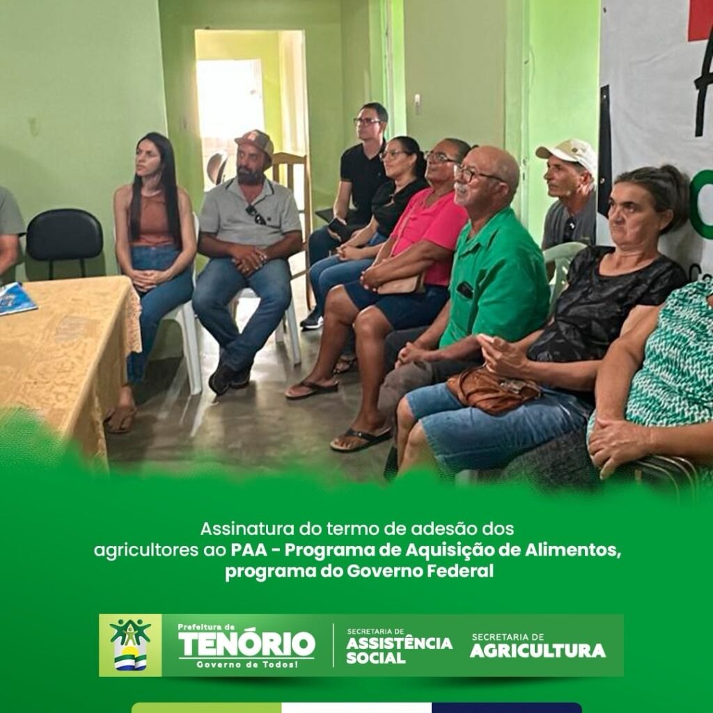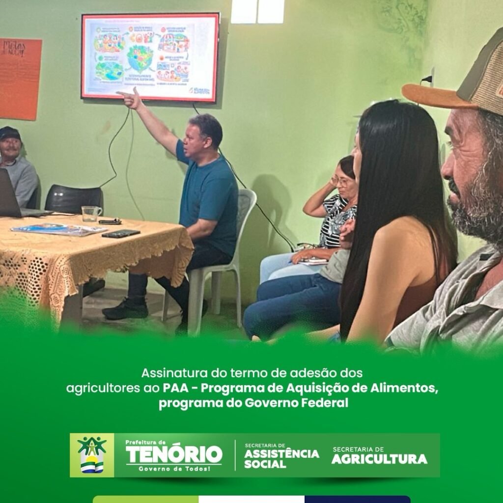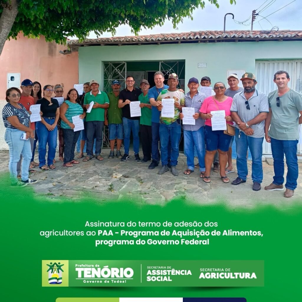 A Prefeitura Municipal de Tenório deu um passo importante nesta semana ao promover a assinatura do termo de adesão de agricultores locais ao Programa de Aquisição de Alimentos (PAA). A iniciativa, do Governo Federal, tem como objetivo fortalecer a agricultura familiar e, ao mesmo tempo, combater a insegurança alimentar no município.