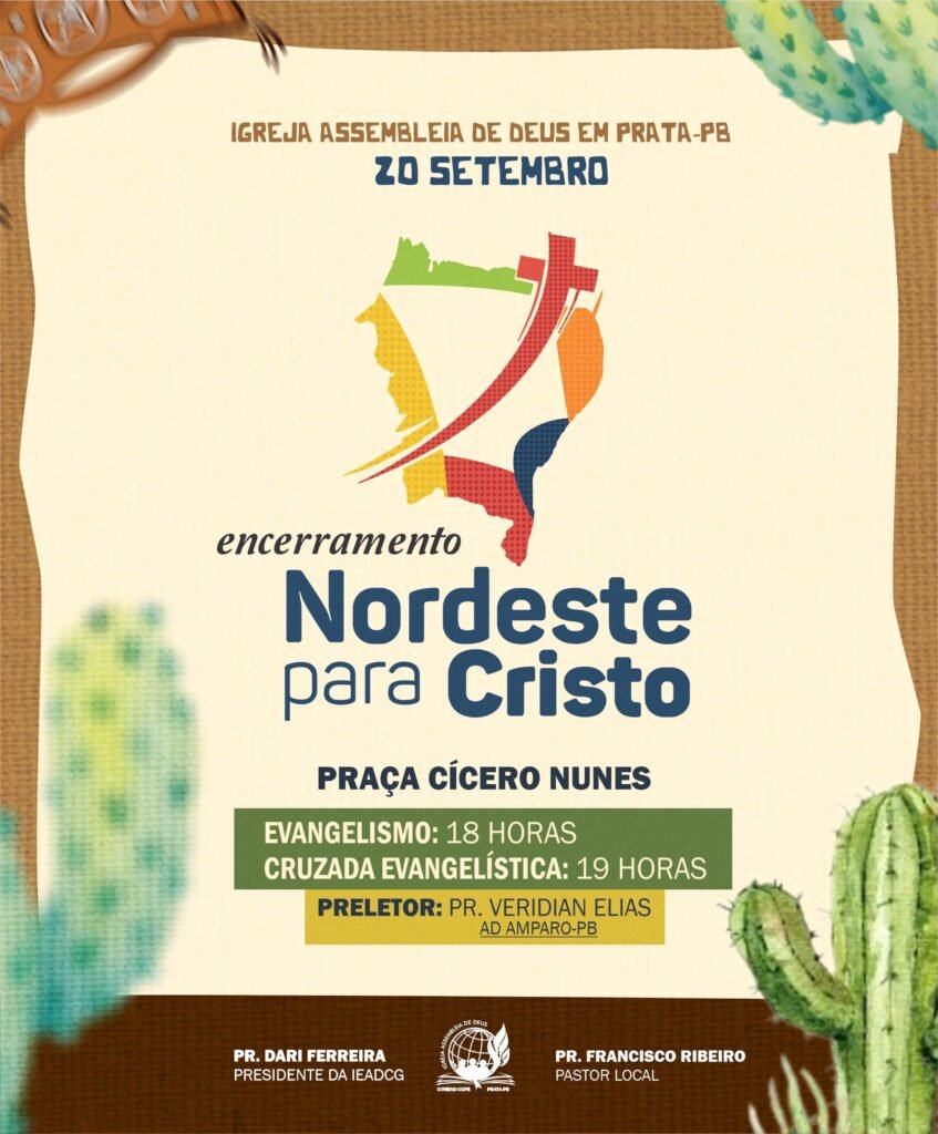 A cidade de Prata, no Cariri paraibano, será palco de um grande momento de fé e adoração no próximo 20 de setembro. A Igreja Assembleia de Deus em Prata-PB realiza o encerramento do projeto “Nordeste para Cristo”, evento que reunirá a comunidade cristã em uma noite especial de evangelização e celebração.