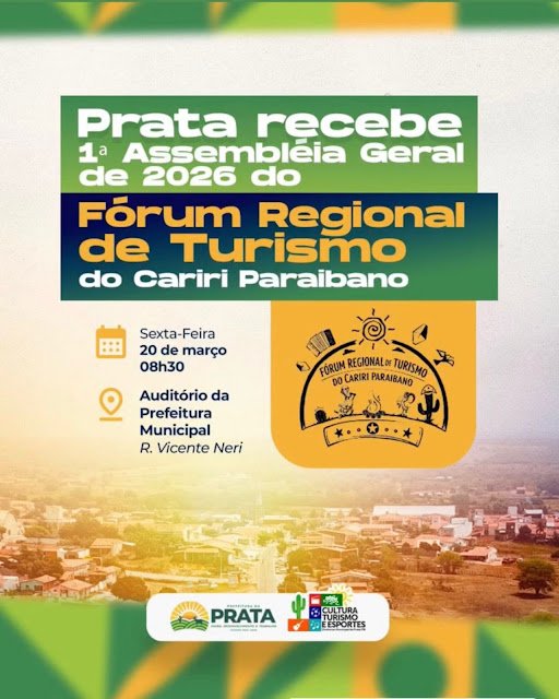 A Diretoria Executiva do Fórum Regional de Turismo do Cariri Paraibano anunciou para o próximo dia 20 de março, na cidade da Prata, a realização da primeira Assembleia Geral Ordinária do ano de 2026. O encontro acontecerá no auditório da Prefeitura Municipal e reunirá representantes de diversos setores ligados ao desenvolvimento do turismo regional.