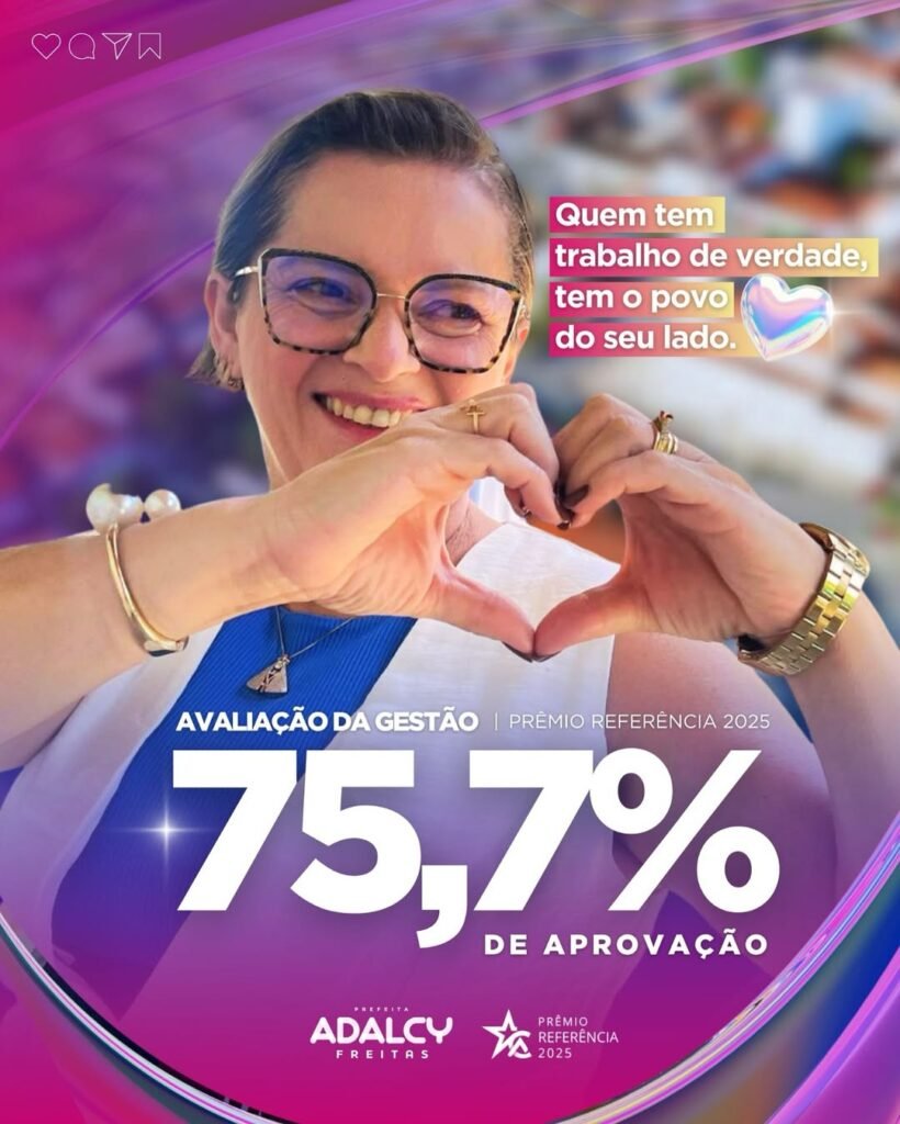 A gestão da prefeita Adalcy Freitas, de São Sebastião do Umbuzeiro, segue colhendo resultados positivos junto à população. De acordo com o Prêmio Referência 2025 do site Cariri em ação , a administração municipal conquistou 75,7% de aprovação, índice que reflete o reconhecimento do povo pelo trabalho realizado nos últimos anos.