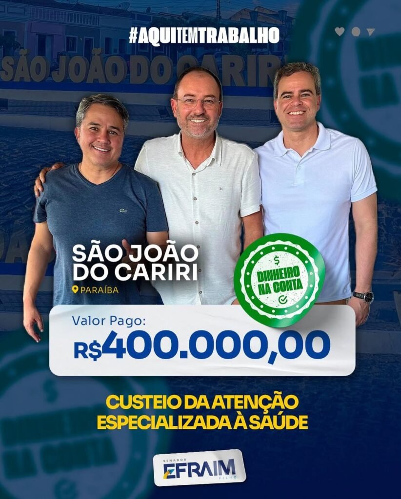 O prefeito também expressou agradecimentos ao deputado estadual George Morais e ao senador Efraim Filho, destacando a parceria e o comprometimento de ambos com as demandas do município. “Agradeço ao Deputado @georgemoraispb e ao senador @efraimfilhopb pela parceria e atenção sempre dedicada à nossa amada cidade”, reforçou.
