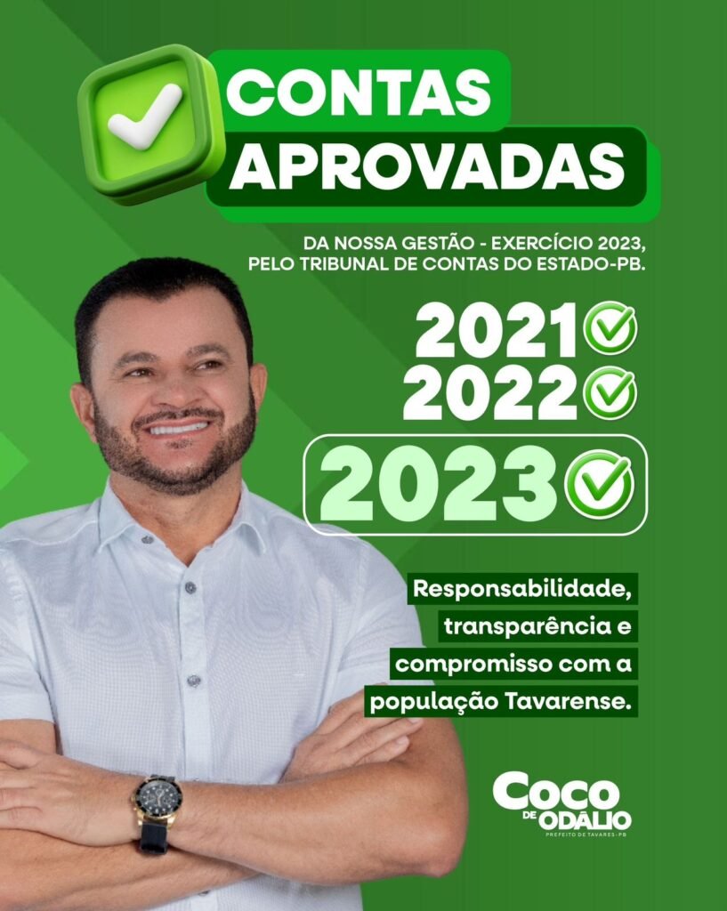“Esse resultado é fruto de uma gestão responsável e comprometida com cada cidadão tavarense. Trabalhamos com planejamento, seriedade e transparência, e ver o reconhecimento do TCE-PB é a prova de que estamos no caminho certo”, destacou o prefeito Coco de Odálio.