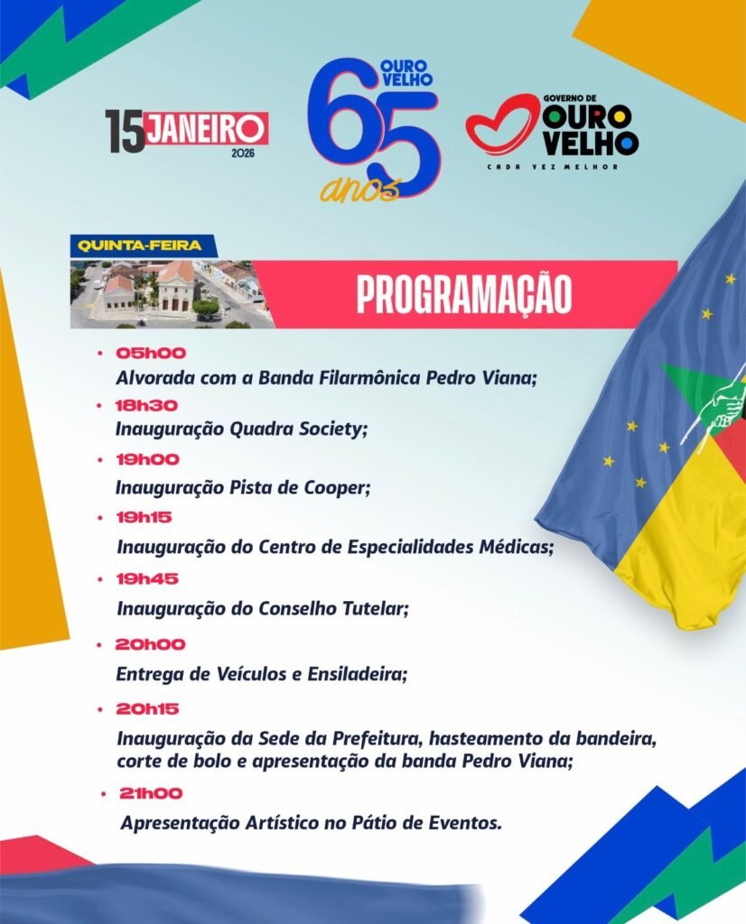 O prefeito Dr. Júnior anunciou oficialmente a programação comemorativa pelos 65 anos de emancipação política de Ouro Velho, celebrados na quinta-feira, 15 de janeiro de 2026. A data será marcada por uma agenda intensa, que reúne atos cívicos, inaugurações, entregas de equipamentos e grandes atrações musicais.