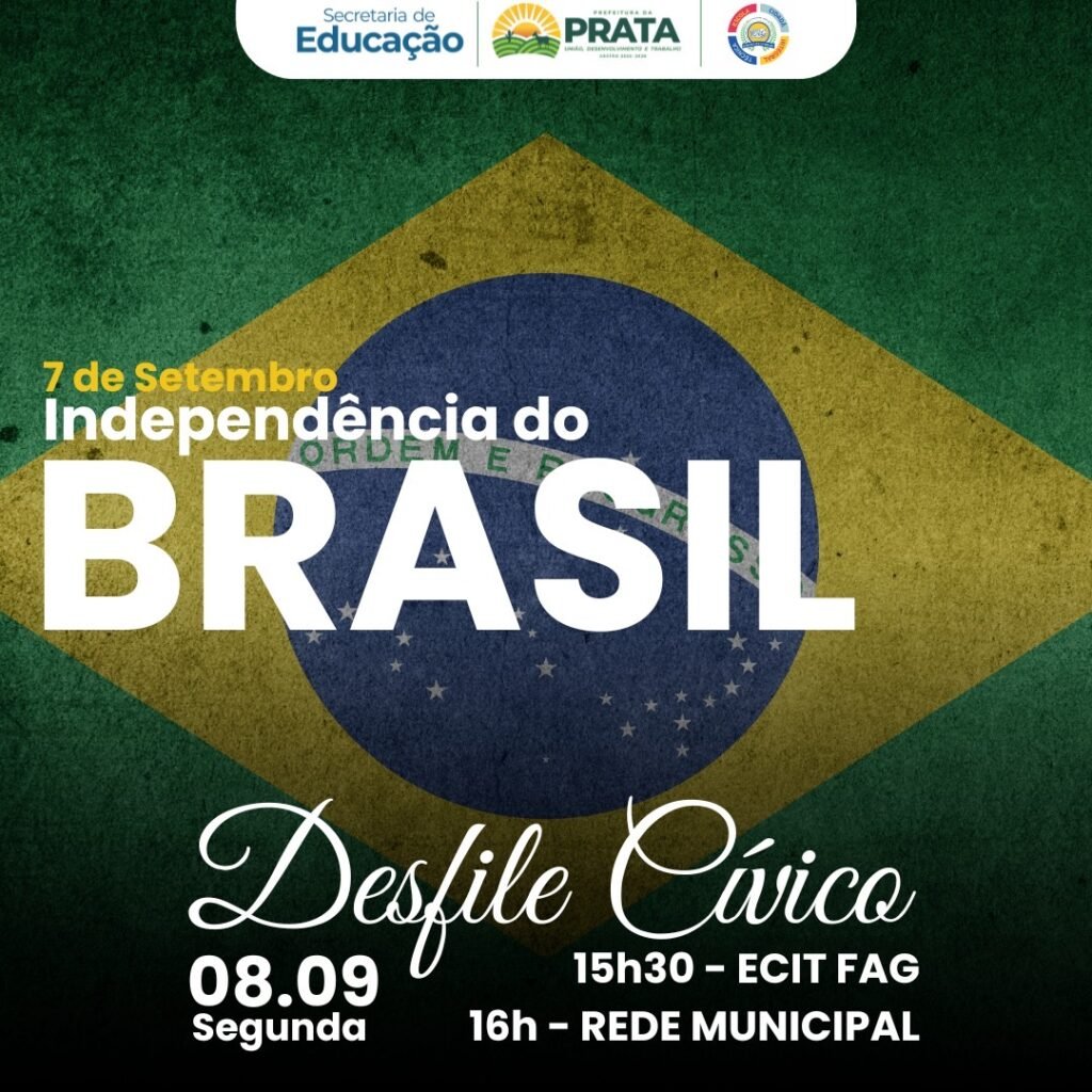 A Prefeitura Municipal da Prata, por meio da Secretaria de Educação e da Escola Cidadã Integral Técnica (ECIT) FAG, divulgou hoje o convite oficial para o Desfile Cívico 2025, em alusão ao Dia da Independência do Brasil.