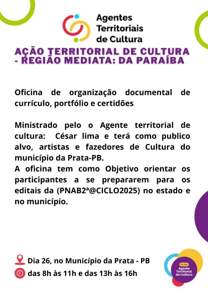 A Prefeitura Municipal da Prata, por meio da Secretaria de Cultura, Turismo e Esportes, em parceria com o Governo do Estado da Paraíba, realizará no próximo dia 26 de setembro a Oficina de Organização Documental de Currículo, Portfólio e Certidões, dentro da ação Agentes Territoriais de Cultura.