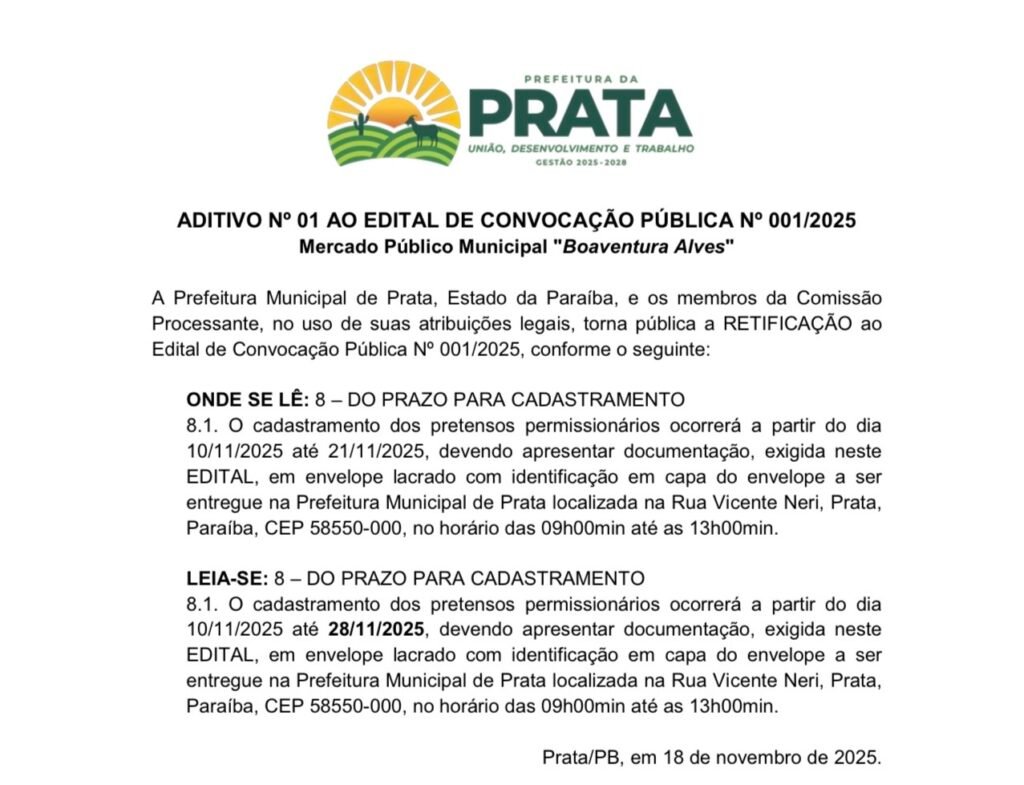 A Prefeitura Municipal da Prata anunciou, por meio de aditivo oficial publicado nesta terça-feira (18), a prorrogação do período de cadastramento referente ao Edital de Convocação Pública nº 001/2025, destinado aos pretensos permissionários do Mercado Público Municipal Boaventura Alves.