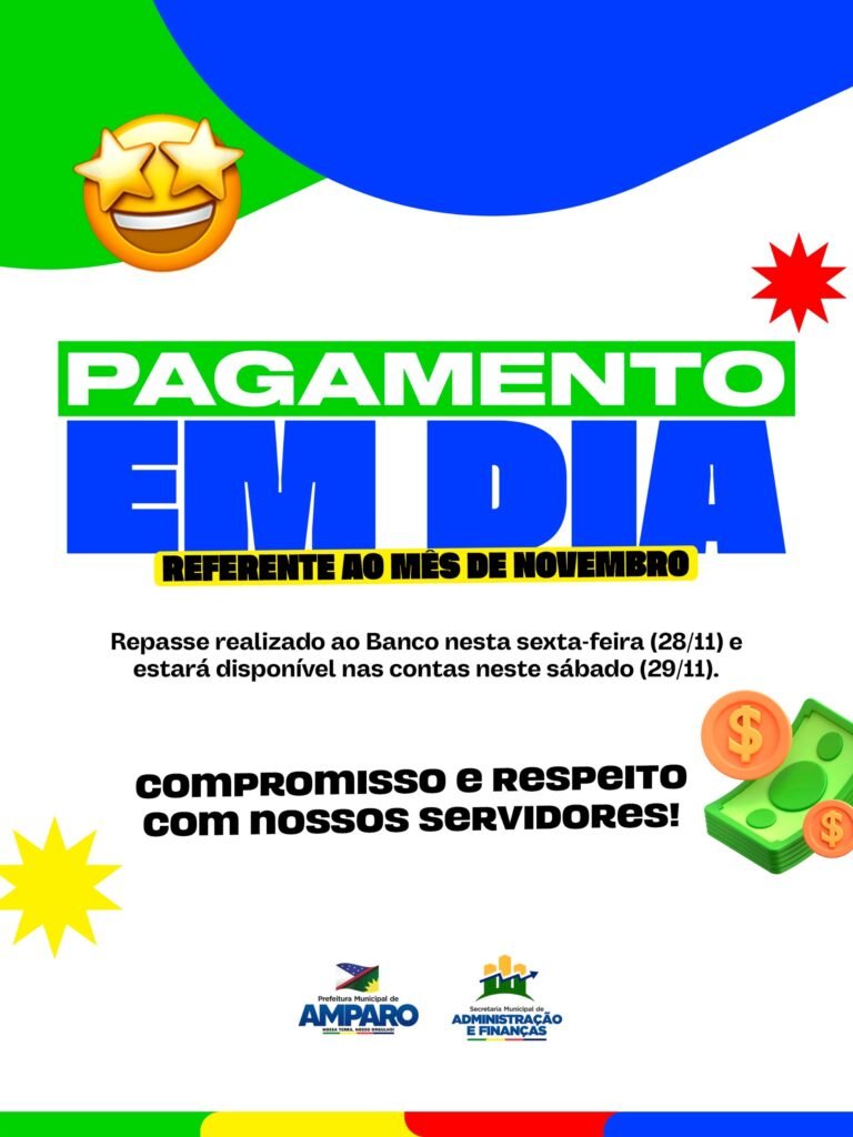 A Prefeitura Municipal de Amparo confirmou que o pagamento referente ao mês de novembro já foi repassado ao banco nesta sexta-feira (28). Os valores estarão disponíveis nas contas dos servidores neste sábado, dia 29 de novembro.