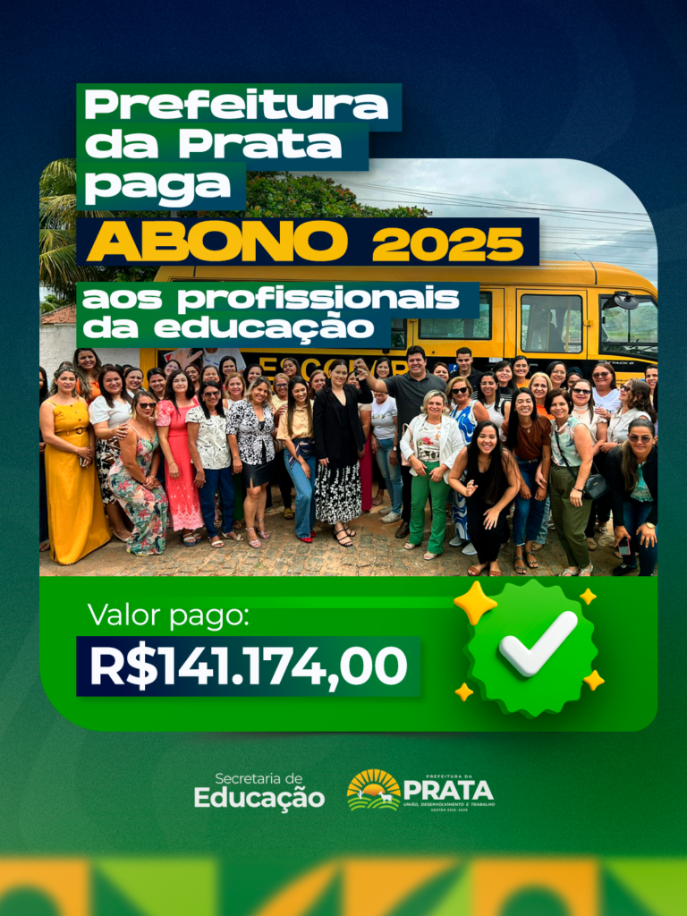 A Prefeitura Municipal de Prata, por meio da Secretaria Municipal de Educação e da Secretaria Municipal de Finanças, realizou o pagamento do Abono 2025 destinado aos profissionais da Educação Básica da rede municipal.