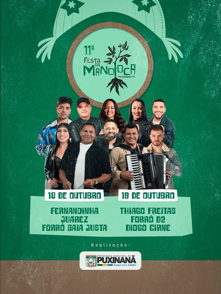 A Prefeitura de Puxinanã divulgou oficialmente as atrações da 11ª edição da Festa da Mandioca, que será realizada entre os dias 16 e 19 de outubro de 2025. O evento, já consolidado como tradição no município, promete este ano ser ainda maior, reunindo tradição, cultura e gastronomia em uma programação especial.