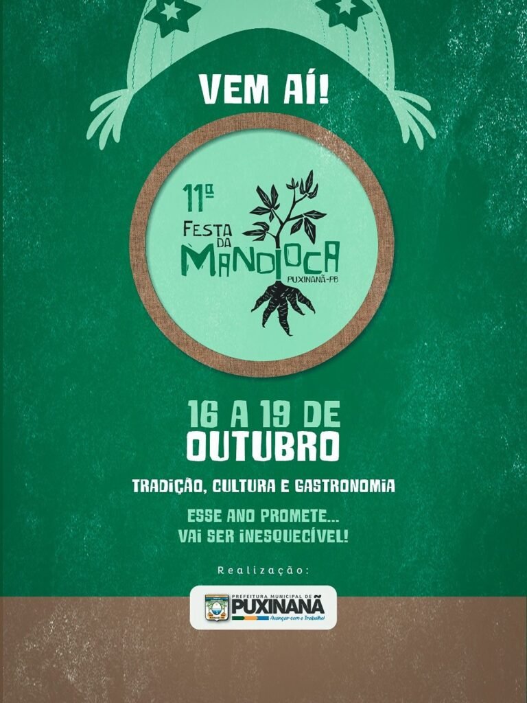 A Prefeitura de Puxinanã anunciou oficialmente as datas da 11ª edição da Festa da Mandioca, um dos eventos mais tradicionais do município. Este ano, a celebração acontecerá entre os dias 16 e 19 de outubro, reunindo cultura, gastronomia e tradição em uma programação que promete movimentar toda a região.