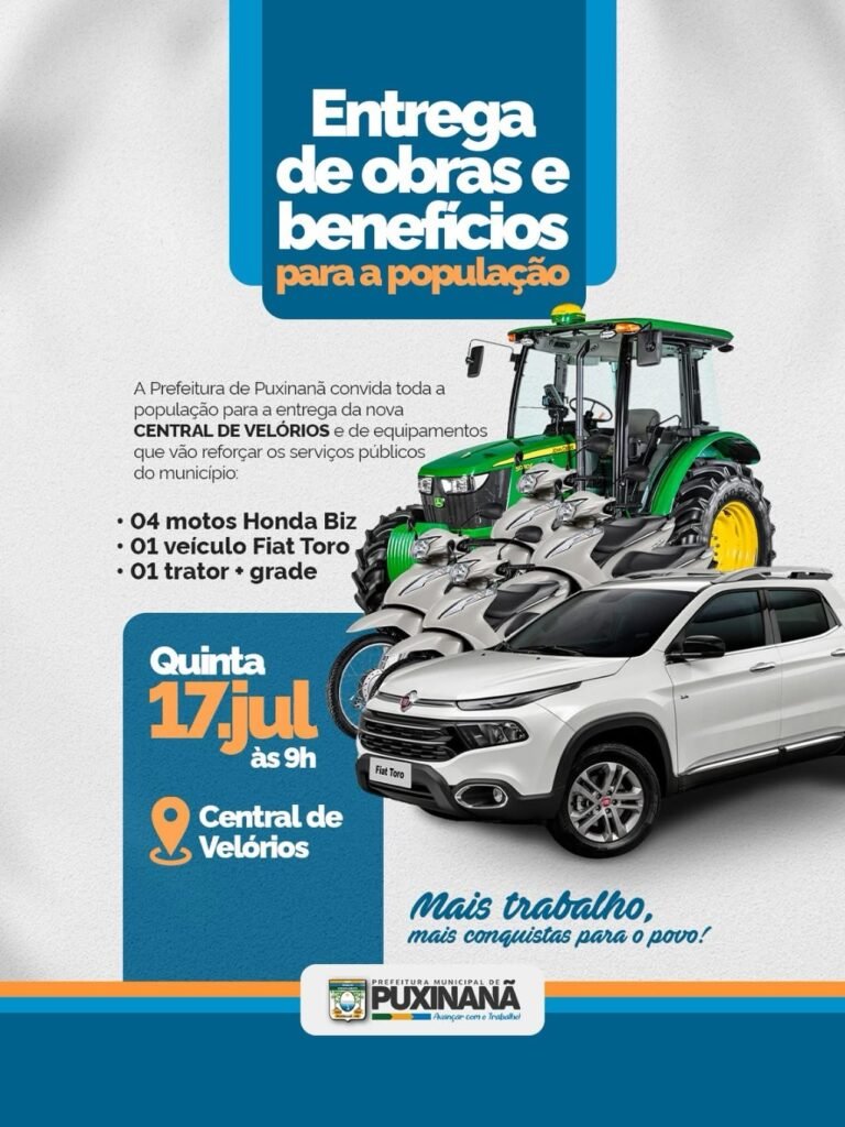 A Prefeitura de Puxinanã, sob a gestão da prefeita Eleusa, realiza nesta quinta-feira (17), às 9h, a entrega oficial da nova Central de Velórios e a distribuição de novos equipamentos que irão fortalecer os serviços públicos do município.