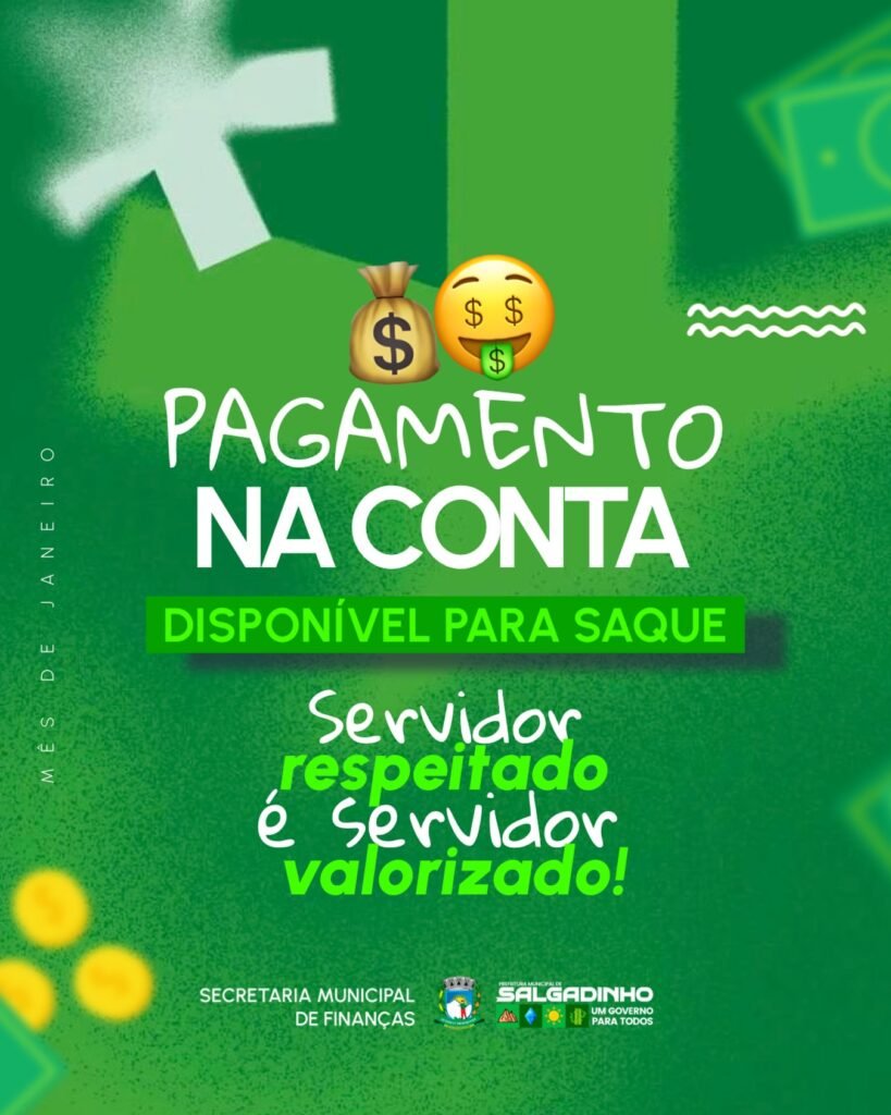 A Prefeitura Municipal de Salgadinho efetuou, nesta sexta-feira, o pagamento dos salários dos servidores públicos municipais referente ao mês de janeiro. A ação foi realizada por meio da Secretaria de Administração e da Secretaria de Finanças, reforçando o compromisso da gestão com a pontualidade e o equilíbrio financeiro do município.