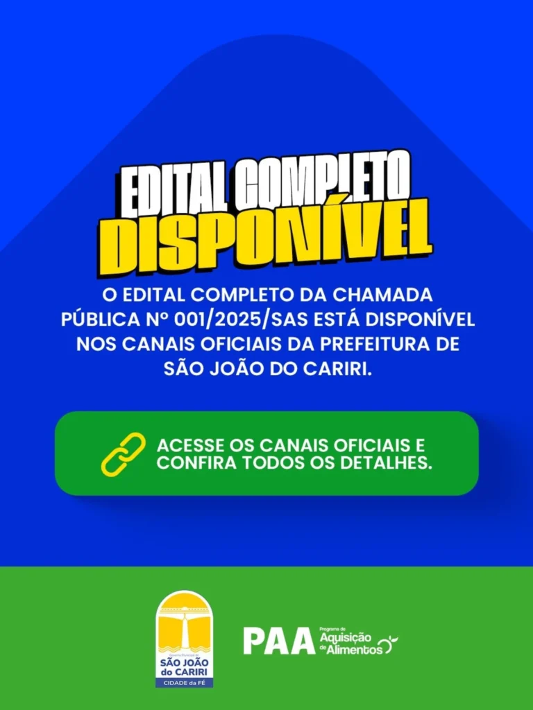A Prefeitura de São João do Cariri orienta que os interessados não deixem para a última hora e procurem a secretaria dentro do prazo para garantir a participação. A iniciativa representa mais um passo no incentivo à produção local, no fortalecimento da agricultura familiar e na promoção de uma alimentação saudável para quem mais precisa.