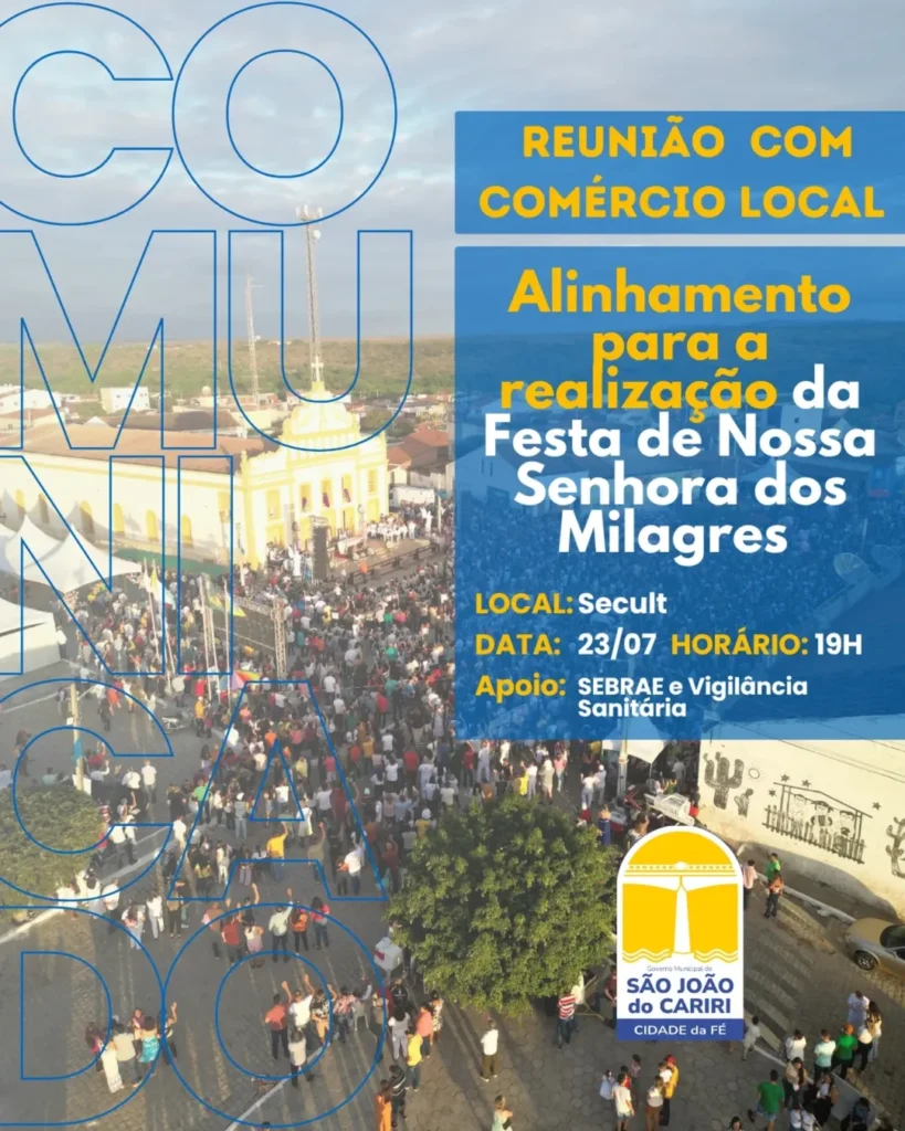 A Prefeitura Municipal de São João do Cariri, por meio da Secretaria de Cultura (SECULT), realizará na próxima terça-feira, dia 23 de julho, uma importante reunião com o comércio local com o objetivo de alinhar estratégias e parcerias para a tradicional Festa de Nossa Senhora dos Milagres.