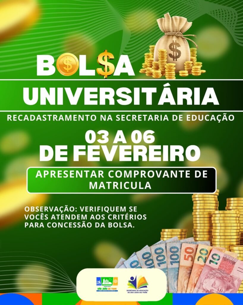 A Prefeitura de São João do Tigre, por meio da Secretaria de Educação, informa a todos os estudantes beneficiários que o recadastramento da Bolsa Universitária será realizado presencialmente no período de 03 a 06 de fevereiro, na Secretaria de Educação do município.