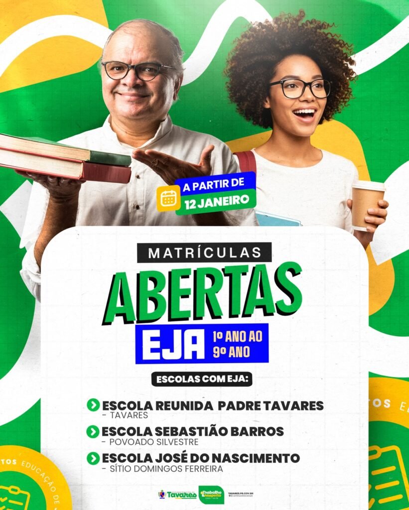A Prefeitura de Tavares convida toda a população que se enquadra na modalidade a procurar a escola mais próxima e garantir sua vaga. Educação transforma vidas.