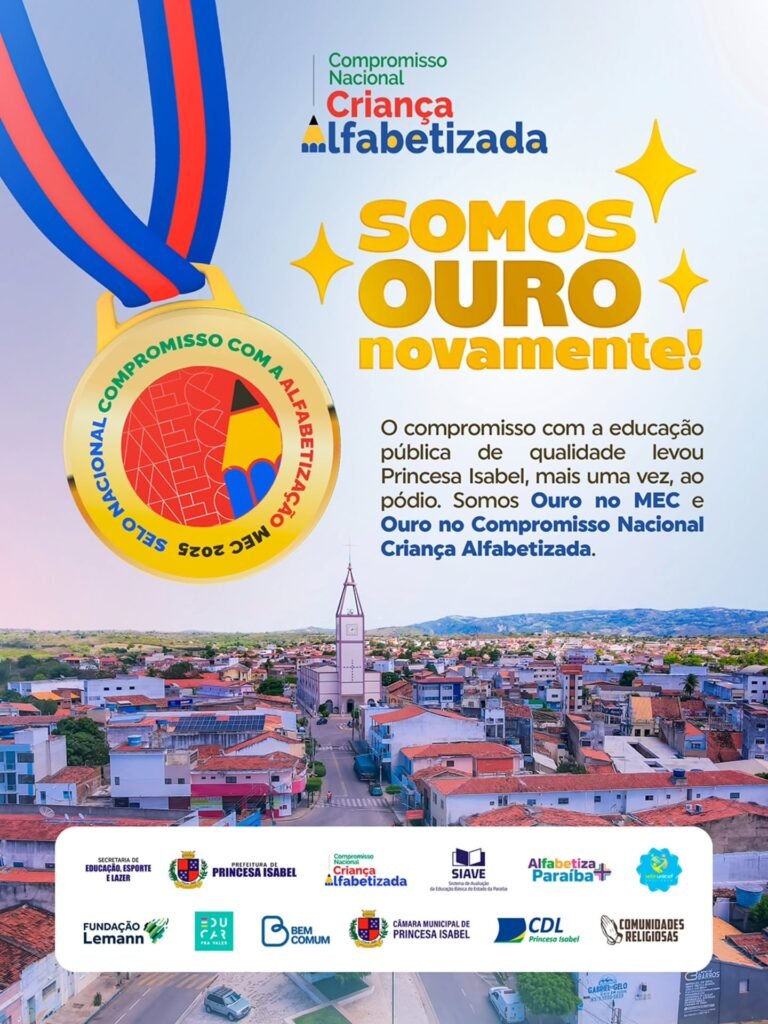 O município de Princesa Isabel foi contemplado, pela segunda vez, com o Selo Ouro do Programa Compromisso Nacional Criança Alfabetizada, a mais alta certificação concedida pelo Ministério da Educação (MEC) aos entes federados que apresentam resultados efetivos na alfabetização infantil.