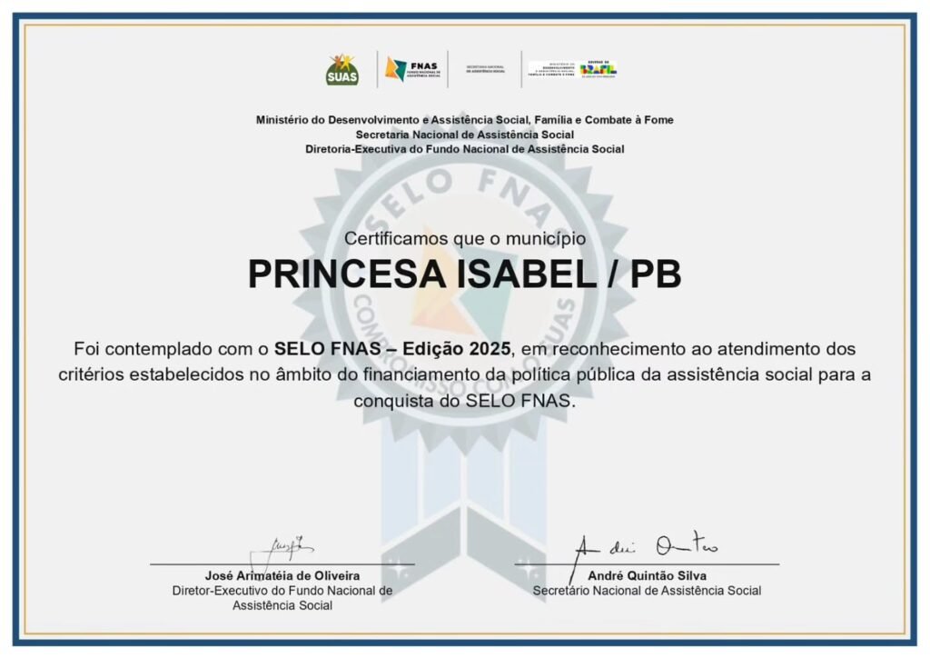 O município de Princesa Isabel foi contemplado com o Selo FNAS – Edição 2025, um importante reconhecimento concedido pelo Fundo Nacional de Assistência Social (FNAS) às cidades que se destacam pela boa gestão dos recursos públicos destinados à assistência social.