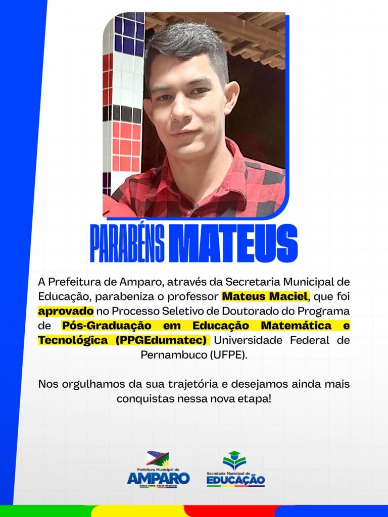 O município de Amparo vive um momento de celebração e orgulho. A Prefeitura Municipal, por meio da Secretaria de Educação, parabenizou oficialmente o professor Mateus Maciel pela aprovação no Doutorado do Programa de Pós-Graduação em Educação Matemática e Tecnológica (PPGEdumatéc), da Universidade Federal de Pernambuco (UFPE).