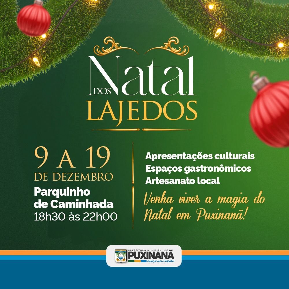 A Prefeitura Municipal de Puxinanã dá início, nesta terça-feira (9), ao Natal dos Lajedos, evento que promete movimentar o município entre os dias 9 e 19 de dezembro, sempre das 18h30 às 22h, no Parquinho de Caminhada. A abertura contará com o acendimento oficial das luzes natalinas, a chegada do Papai Noel e apresentação da Creche Filismina Gonçalves de Queiroz.