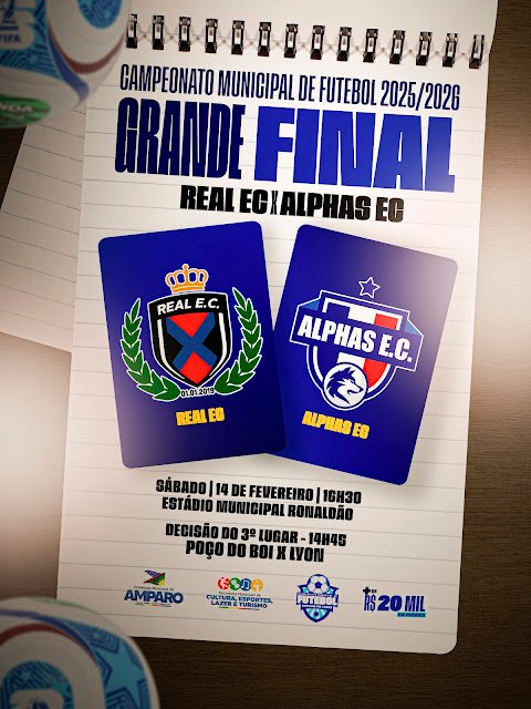 A Prefeitura Municipal de Amparo, por meio da Secretaria Municipal de Cultura, Esportes, Lazer e Turismo, realiza neste sábado (14) a grande final do Campeonato Municipal de Futebol 2025/2026. A decisão acontece às 16h30, no Estádio Municipal Ronaldão, reunindo as equipes Real E.C. e Alphas E.C. em um confronto que promete fortes emoções e casa cheia.