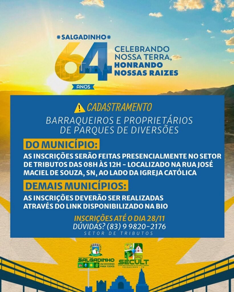 A Prefeitura Municipal de Salgadinho deu início ao cadastramento de barraqueiros e proprietários de parques de diversões que desejam participar da programação dos 64 anos de emancipação política do município. A festa, que celebra a história, a cultura e as raízes do povo salgadinhense, contará com estrutura especial e organização voltada ao fortalecimento do comércio local e do entretenimento.