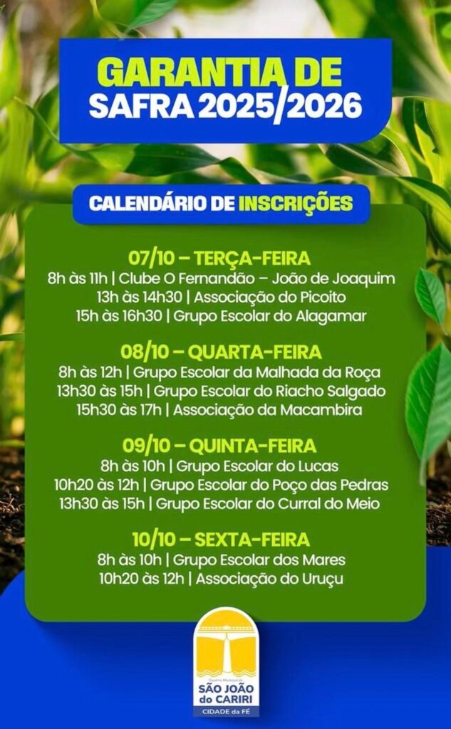 A Prefeitura Municipal de São João do Cariri anunciou o cronograma oficial de inscrições para o Programa Garantia-Safra 2025/2026, iniciativa que assegura apoio financeiro a agricultores familiares em caso de perdas na produção por estiagem ou excesso de chuvas.