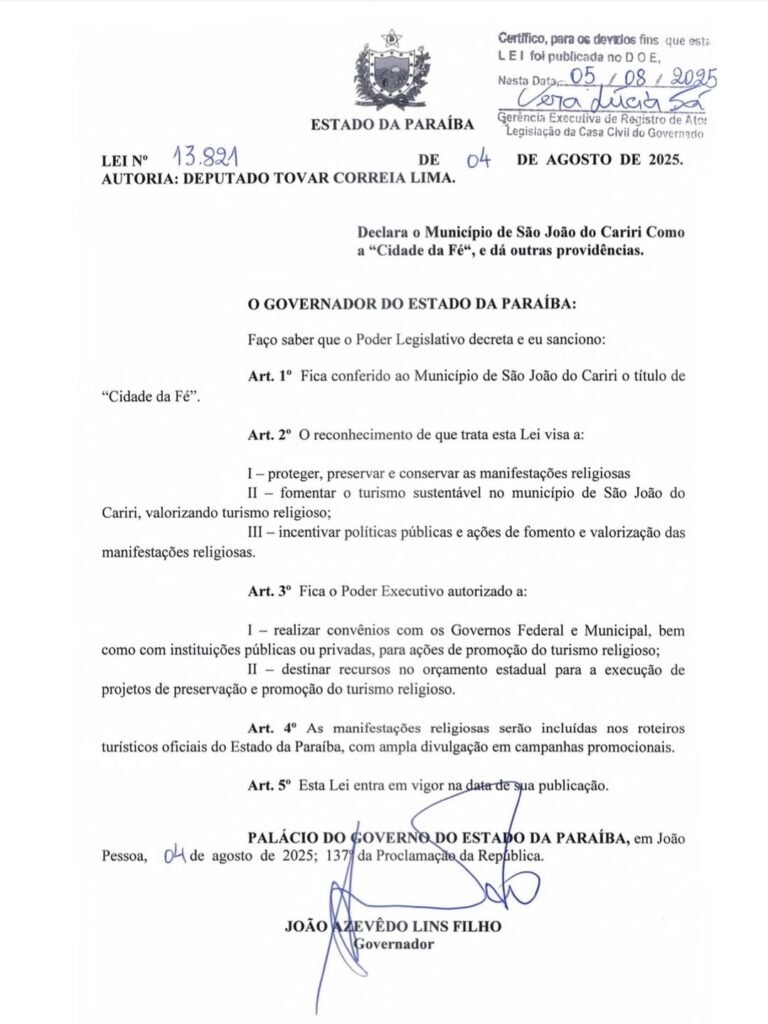 A nova legislação, aprovada pela Assembleia Legislativa do Estado, reconhece e valoriza a forte identidade religiosa e cultural de São João do Cariri, destacando o papel fundamental da fé na vida da população e no desenvolvimento local.