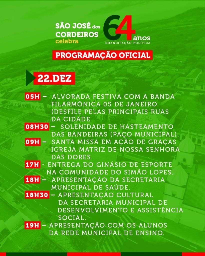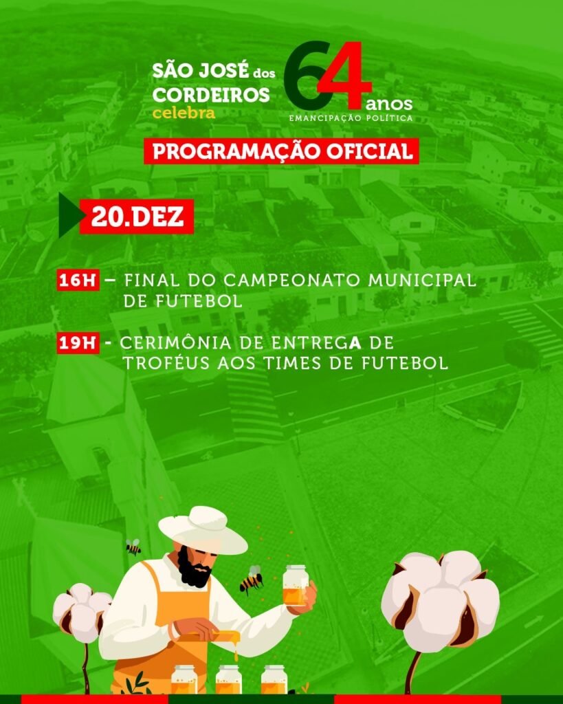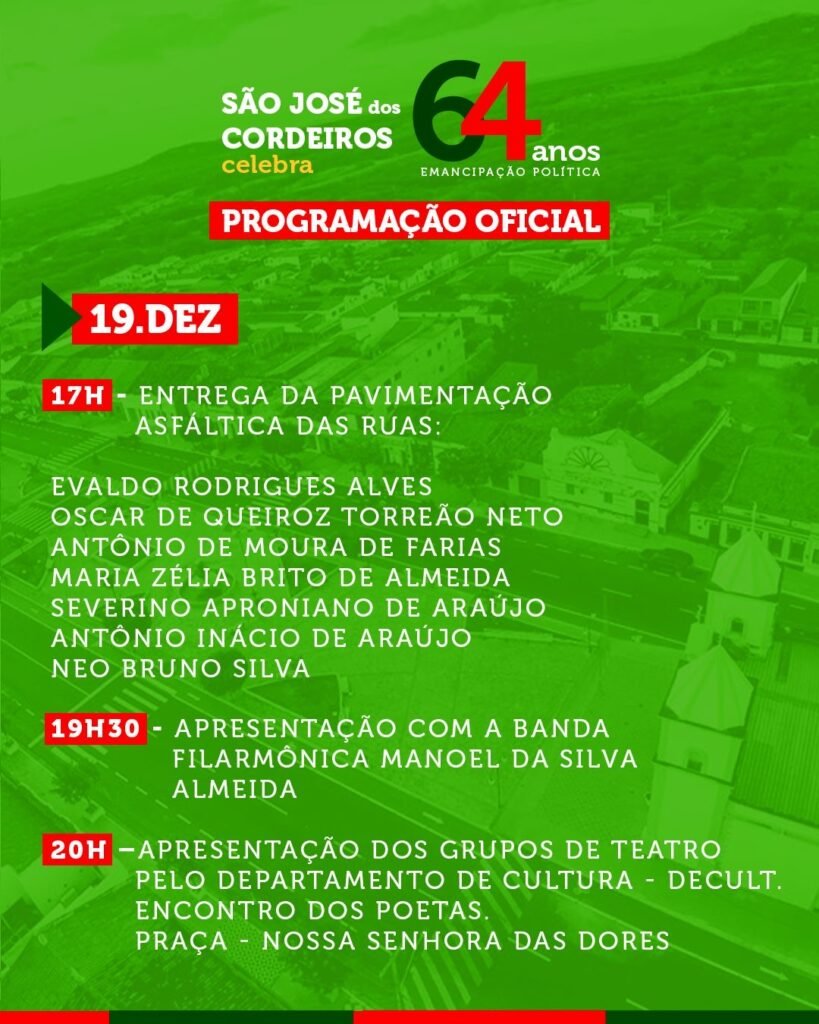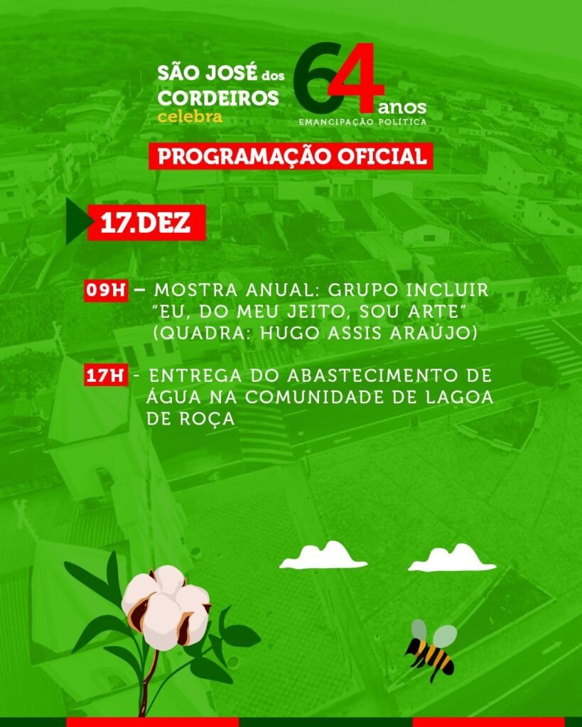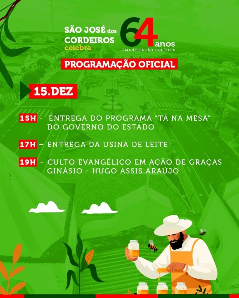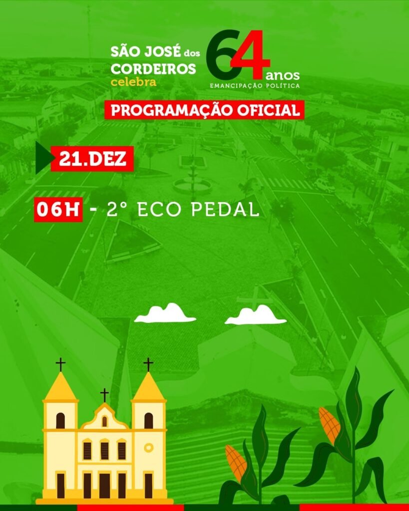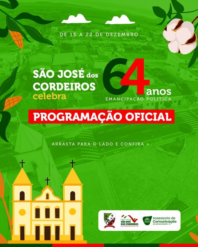 São José dos Cordeiros inicia, nesta segunda-feira (15), a programação comemorativa pelos seus 64 anos de Emancipação Política, que segue até o dia 22 de dezembro. A agenda reúne fé, desenvolvimento, cultura, esporte e importantes entregas que refletem o atual momento de crescimento vivido pelo município.