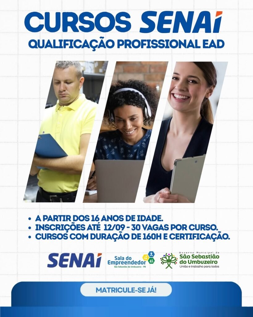 A Prefeitura de São Sebastião do Umbuzeiro, por meio da Sala do Empreendedor, firmou parceria com o SENAI/PB para oferecer três cursos de qualificação profissional totalmente gratuitos, na modalidade de Ensino a Distância (EaD). A iniciativa busca ampliar as oportunidades no mercado de trabalho e preparar jovens e adultos para funções estratégicas no setor produtivo.