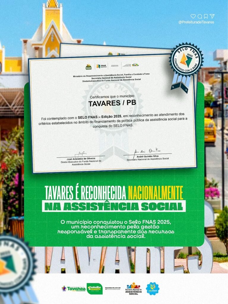 O município de Tavares alcançou um importante reconhecimento em nível nacional ao conquistar o Selo FNAS 2025, concedido pelo Fundo Nacional de Assistência Social (FNAS). A certificação destaca a excelência na gestão dos recursos públicos e o compromisso com a execução das políticas de assistência social.
