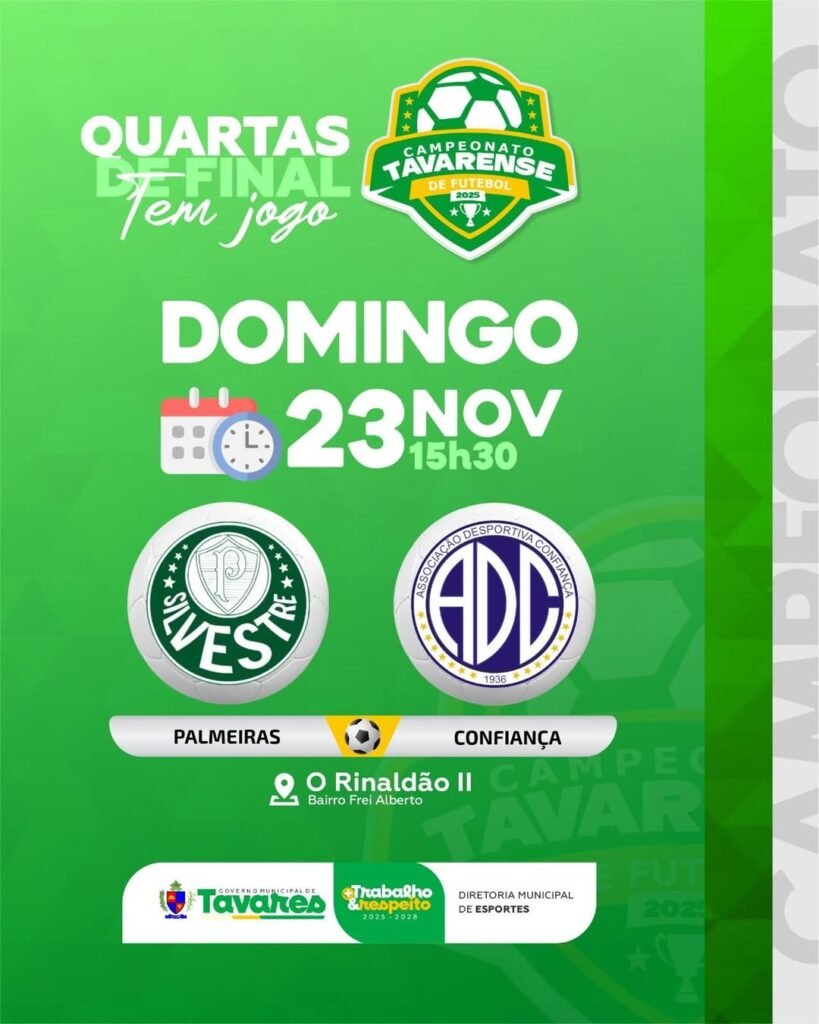 O clima de decisão toma conta de Tavares neste fim de semana com a realização das quartas de final do Campeonato Tavareense 2025. A competição, que já vem mobilizando atletas e torcedores de toda a região, promete jogos intensos no Estádio Rinaldão II, localizado no Bairro Frei Alberto.