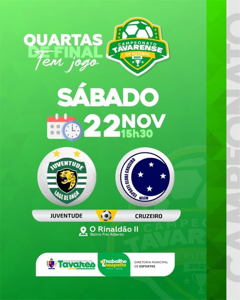 O clima de decisão toma conta de Tavares neste fim de semana com a realização das quartas de final do Campeonato Tavareense 2025. A competição, que já vem mobilizando atletas e torcedores de toda a região, promete jogos intensos no Estádio Rinaldão II, localizado no Bairro Frei Alberto.