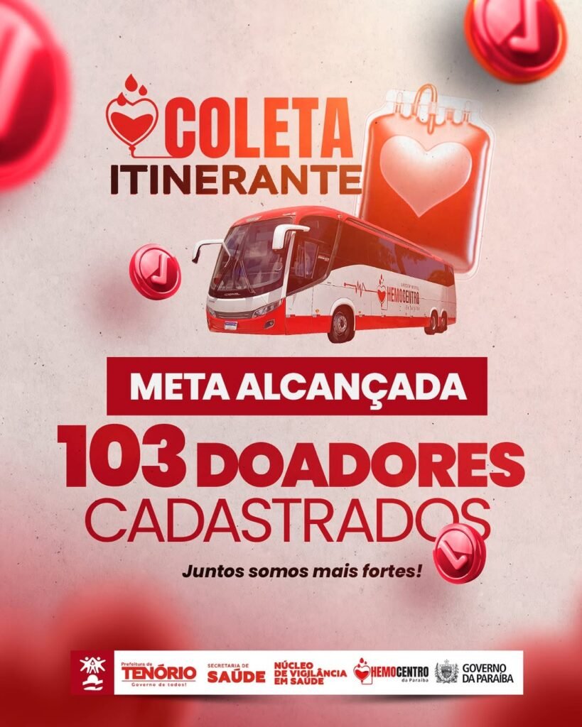A cidade de Tenório vivenciou nesta semana um gesto marcante de solidariedade. A Coleta Itinerante de Sangue, realizada em parceria com órgãos de saúde, foi um verdadeiro sucesso e superou todas as expectativas, contando com 103 doadores cadastrados.