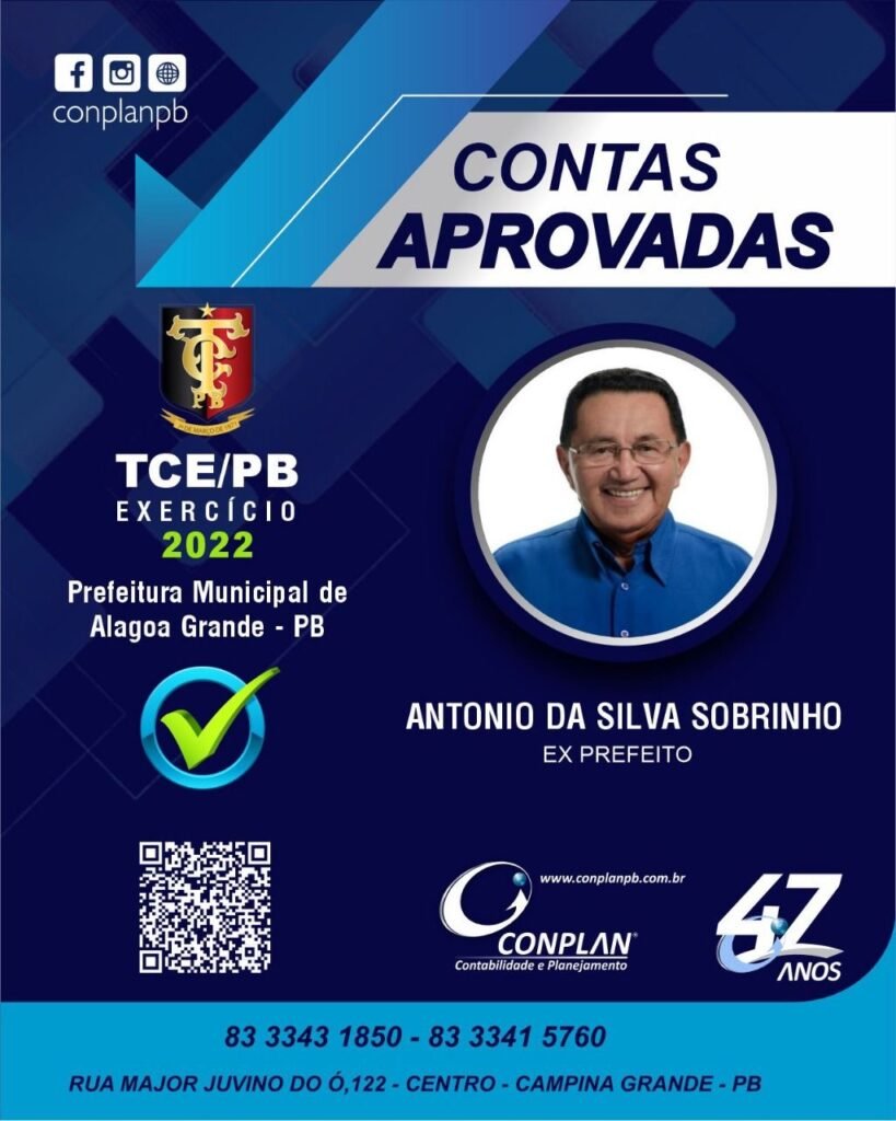 Agradecemos a toda a equipe da CONPLAN pelo empenho e dedicação nas atividades desenvolvidas com zelo e comprometimento e por fim agradecemos ao ex prefeito DR SOBRINHO pela parceria e confiança no nosso trabalho. Ficamos felizes em poder contribuir para o resultado final de excelência na gestão púbica municipal de Alagoa Grande, com as contas de 2017, 2018, 2019, 2020, 2021 e 2022 aprovadas.