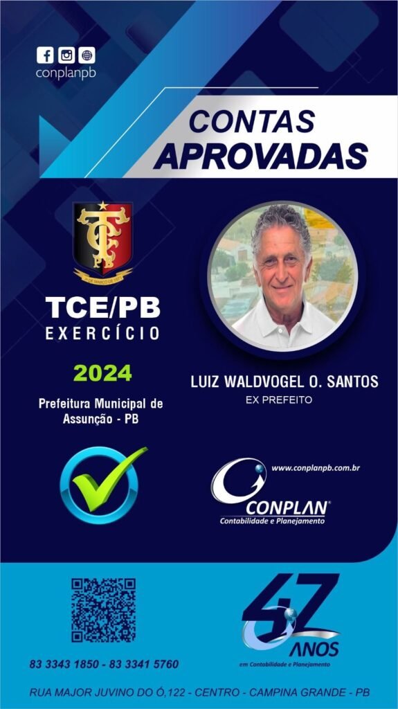 Durante sessão plenária na manhã desta quarta feira 24/09/2025, o Tribunal de Contas do Estado da Paraíba, aprovou por unanimidade as contas do município de Assunção – PB, correspondente ao exercício financeiro de 2024, que teve como prefeito o senhor LUIZ WALDVOGEL DE OLIVEIRA SANTOS (VOGEL). Parabenizamos a todos os servidores e assessores da Prefeitura Municipal de Assunção, que dedicaram-se e dedicam-se aos seus trabalhos com empenho e zelo, tendo comprometimento com o serviço público, como também ao ex prefeito VOGEL, que teve total zelo com o erário público, cumprindo com todas as normas existentes e determinações legais, dedicando-se diuturnamente para o bem coletivo da população de Assunção. Agradecemos a toda a equipe da CONPLAN pelo empenho e dedicação nas atividades desenvolvidas com zelo e comprometimento e por fim agradecemos ao ex prefeito VOGEL pela parceria e confiança no nosso trabalho. Ficamos felizes em poder contribuir para o resultado final de excelência na gestão púbica municipal de Assunção, com as contas de 2017, 2018, 2019, 2020, 2021, 2022 e 2024 aprovadas, faltando agora só a do exercício de 2023 que ainda estar em analise.